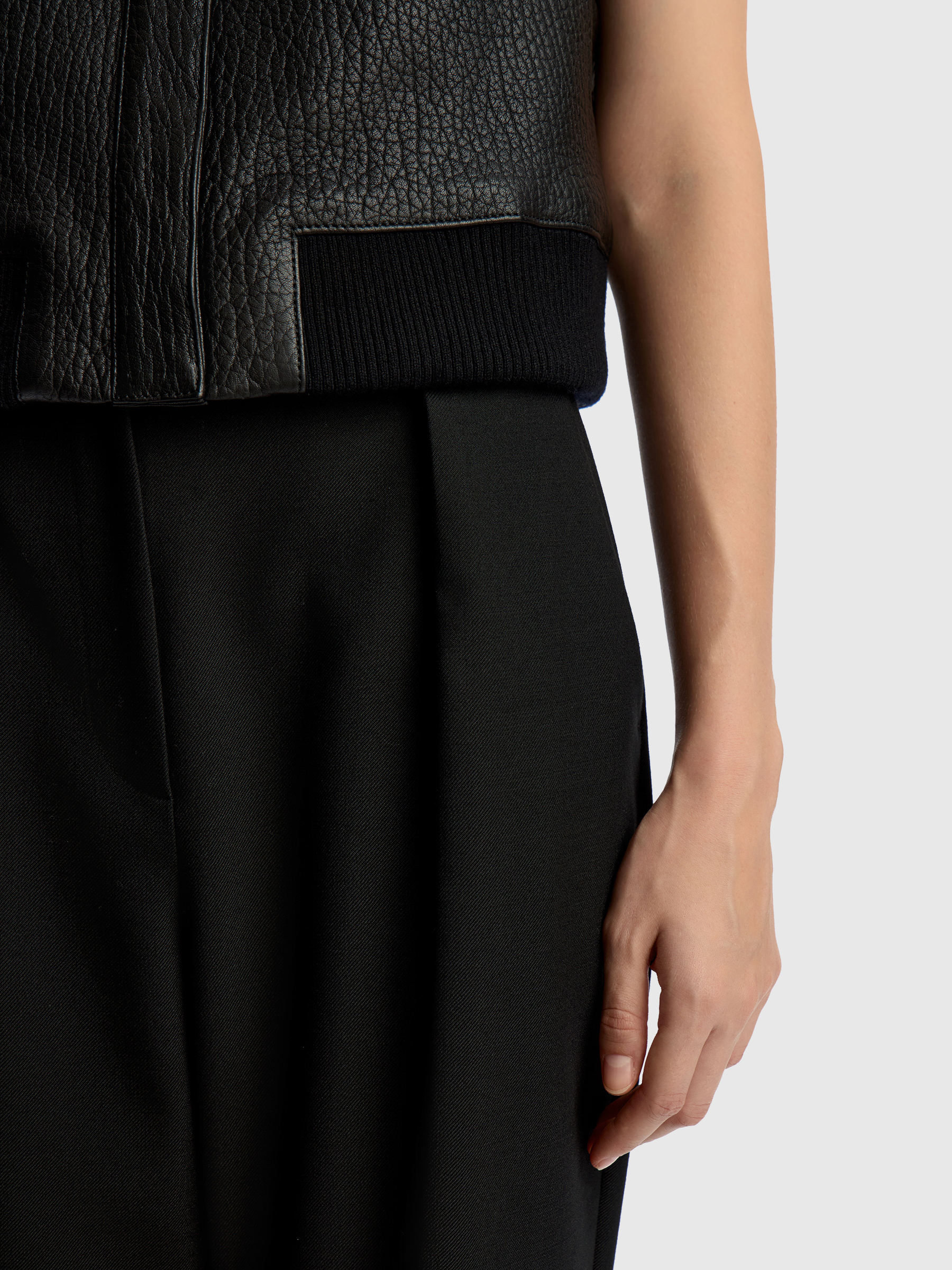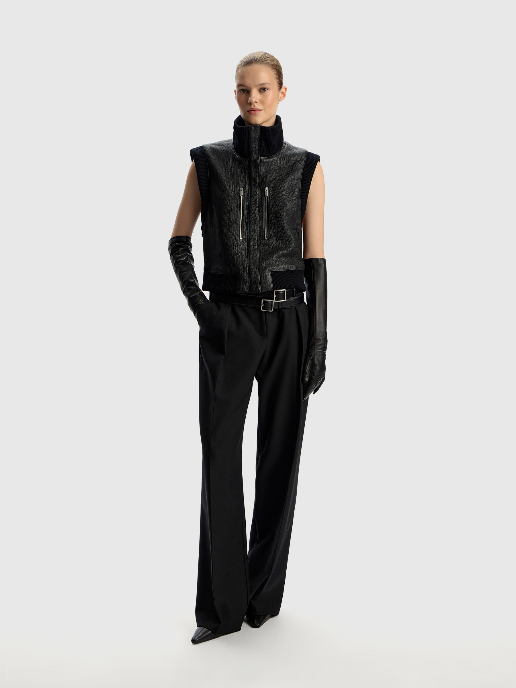100% Натуральная кожа. Основная ткань 2: 96% Шерсть, 4% Эластан. Подкладка: 50% Полиэстер, 50% Вискоза